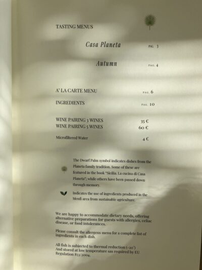 よく晴れたシチリアの気持ち良い太陽とそよ風を浴びながらテラスでいただいた“プラネタ風魚介のミネストローネ” (Minestra di pesce)は、魚介の旨みと地中海ハーブの香りが溶け込んだ絶品スープで、合わせて飲んだコメータとのペアリングはこの旅で最も印象的なペアリングだった。
