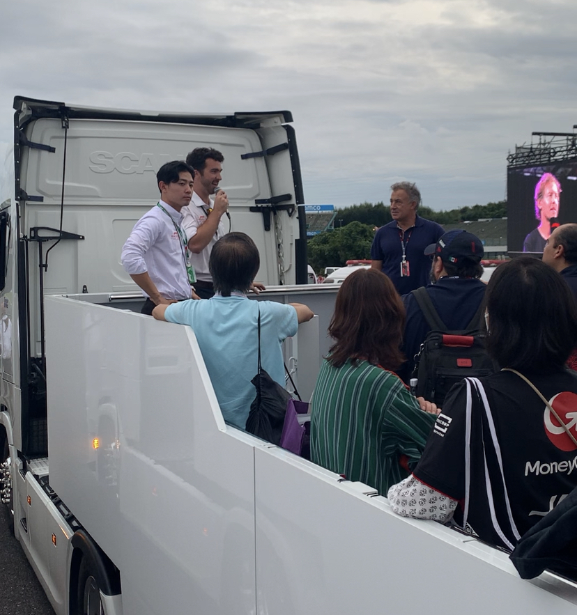 右:トラックツアー。実際のレーストラックを、元F1ドライバーや関係者による解説を聞きながら、オープンエアーのトラックに乗って走ります。テレビではわからない、実際のコースの高低差やコーナーの凸凹を見て、これらに耐えうるドライバーたちの超人的な肉体と精神力と判断力をまたしても感じて、愕然とするのでした。ジャン・アレジ氏がご対応くださいました!