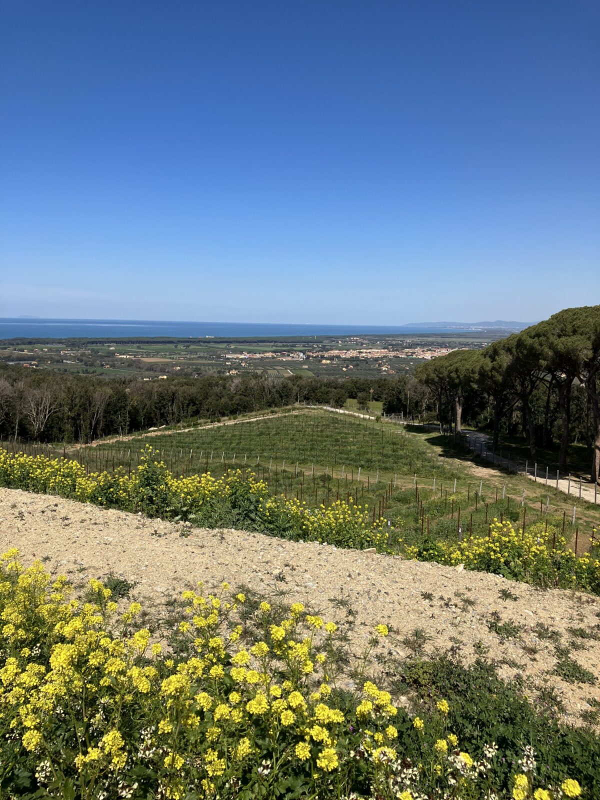 一番初めに案内されたのは、ボルゲリでも最も標高の高い畑の1つである、標高240mの畑です。美しい海が見渡せるところで、ゴルゴーナ島を望むことができました!(イタリア版アルカトラズ島のようなところです。)