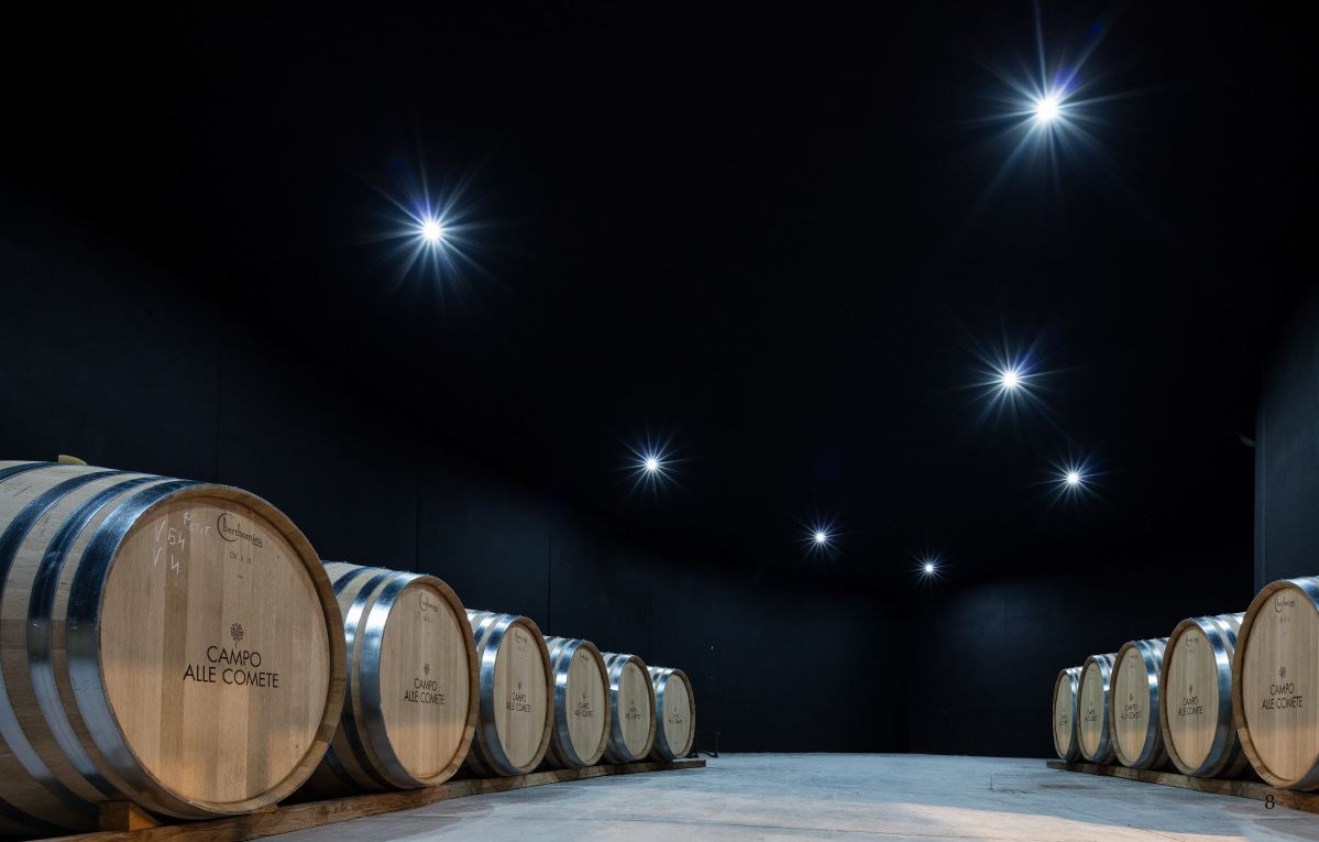 「カンポ・アッレ・コメーテ(彗星が降り注ぐ場所)」とは、歴史学書に記載されている、古くから存在するこのワイナリーの実際の地名です。広く開けた土地で、今でも夏にはたくさんの星が、まるで降り注ぐかのように見えるところだそうです。時を経て、いつしか地元の地図からはその名前が消滅してしまったそうですが、とても好奇心をくすぐられ、想像力をかき立てられるこの名前にすっかり魅了され、この名前をワイナリーに付けたのだそうです。