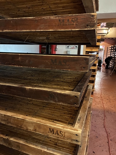 こちらはアパッシメントが行われている部屋。スノコのような棚は、アレーレと呼ばれています。なんと今年はアパッシメントに最適な天気が続いたということで、通常よりかなり早い時期にアパッシメントが終了。逆に貴重なアパッシメント後のお掃除作業を拝見することができました。