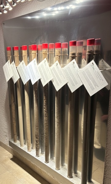 土壌の違いが分かるディスプレイ。色や細かさがそれぞれ違うのが確認できます。この違いが、ワインの個性となって表れます。このように展示されることで、言葉で聞くよりも分かりやすく違いを認識することが出来ますよね。まさに百聞は一見に如かず。