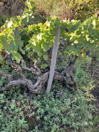 ゴロゴロと火山岩が転がる道なき道を抜けた離れにある、もともと耕作放棄地だった0.5haの小さな畑だが、ここには樹齢100年を超えるフィロキセラの時代を生き抜いたブドウが今も植っている。