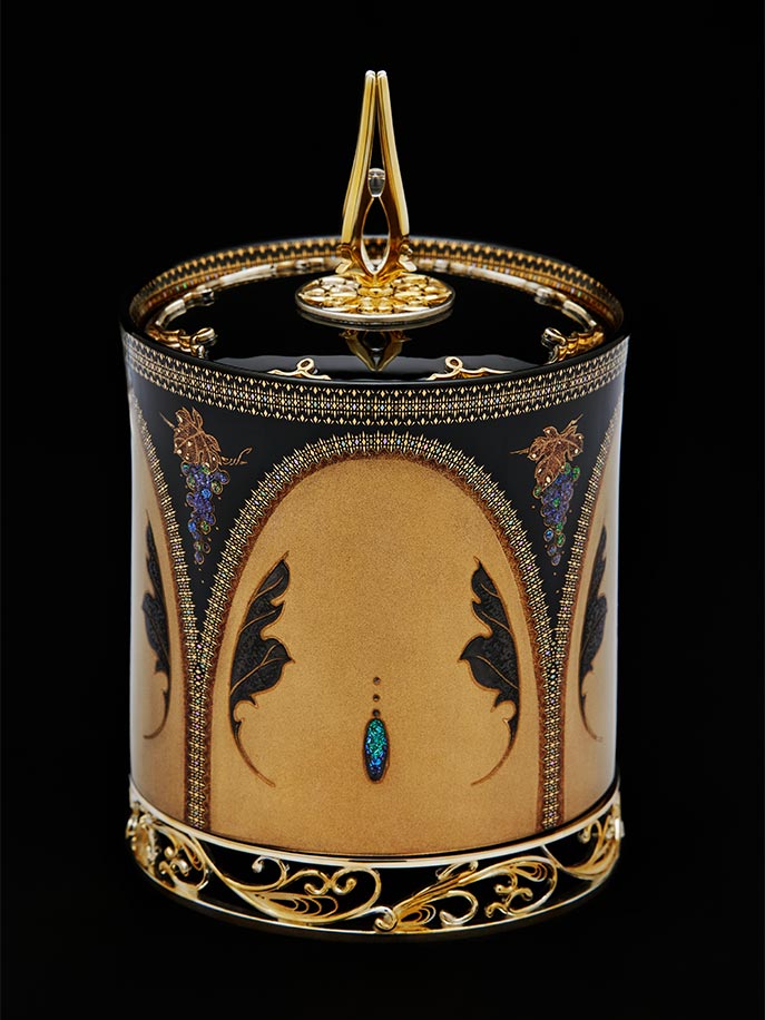 - 作品名:『西香(さいこう)』 「西(ヨーロッパ)」の「香(かおり)」を意味します。イタリアのブドウとワインが放つ芳醇な香りを表現した香炉です。金粉や螺鈿(らでん:貝殻の内側を使った装飾)を駆使し、約2年の歳月をかけて制作されました。