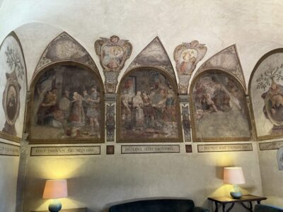 1051年ジョヴァンニ・グアルベルト修道士が貴族からベネディクト派のサン・ロレンツォ教会を寄付されたことから歴史がスタートし、地震や戦争によって一部倒壊した箇所もあるが、ワイナリーのほとんどは昔からのもので、実際に1500年代に描かれたフレスコ画が現存していて、歴史と厳かな雰囲気を味わうことができる。