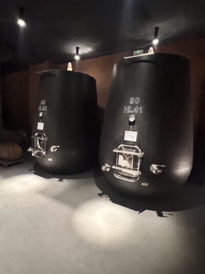 ワイナリーでは、醸造設備と畑を見学した。醸造所はちょうどプレスを終えた直後で、清潔感とともに収穫期ならではの活気に満ちていた。発酵は主にステンレスタンクで行われ、熟成には伝統的な大樽に加え、一部バリックも使用。さらに近年は、試験的にコンクリートタンクの導入も始めているという。
