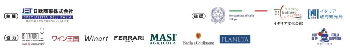 後援:イタリア大使館、イタリア文化会館、イタリア政府観光局協力:リーデル・ジャパン、ワイン王国、Winart、FERRARI(フェッラーリ)、MASI(マァジ)、BADIA A COLTIBUONO(バディア・ア・コルティブオーノ)、PLANETA(プラネタ)