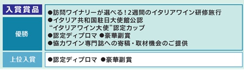優勝者に贈られる2週間のイタリアワイン研修旅行をはじめ、入賞された方々にも、寄稿や取材、特別なワインセミナーへのご招待など様々なご活躍のチャンスをご用意しております。